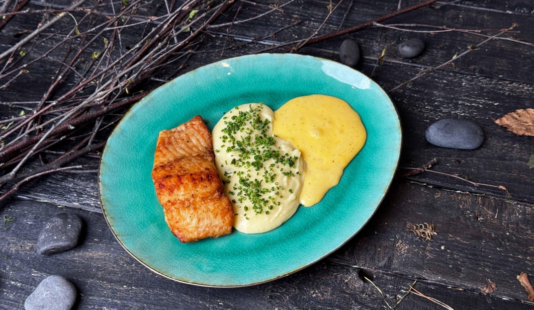 - Муксун с картофельным пюре и лимонным голландез